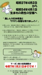 昭和37年4月2日~昭和54年4月1日生まれの男性の方を対象に、風しんの抗体検査とワクチン接種を公費で受けることができます。